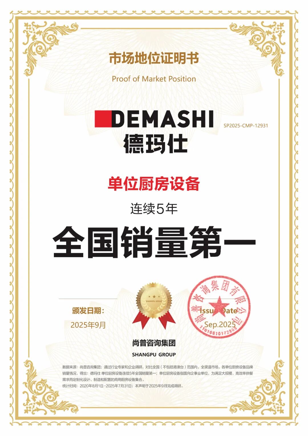 在收获的季节,德玛仕再传捷报。近日,尚普咨询集团正式授予德玛仕【单位厨房设备连续5年全国销量第一】市场地位声明。这是对德玛仕市场表现与用户认可度的最强印证,也是德玛仕在单位厨房设备领域领导地位的又一次有力彰显。